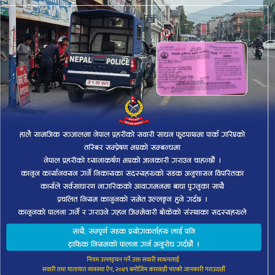 काठमाडौं — सडक अनुशासन उल्लंघन गरेको आरोपमा ट्राफिक प्रहरीले नेपाल प्रहरीकै एक भ्यानलाई कारबाही गरेको छ। फुटपाथमा सवारी पार्क गरिएको पाइएपछि सम्बन्धित भ्यानलाई चिट काटिएको हो।