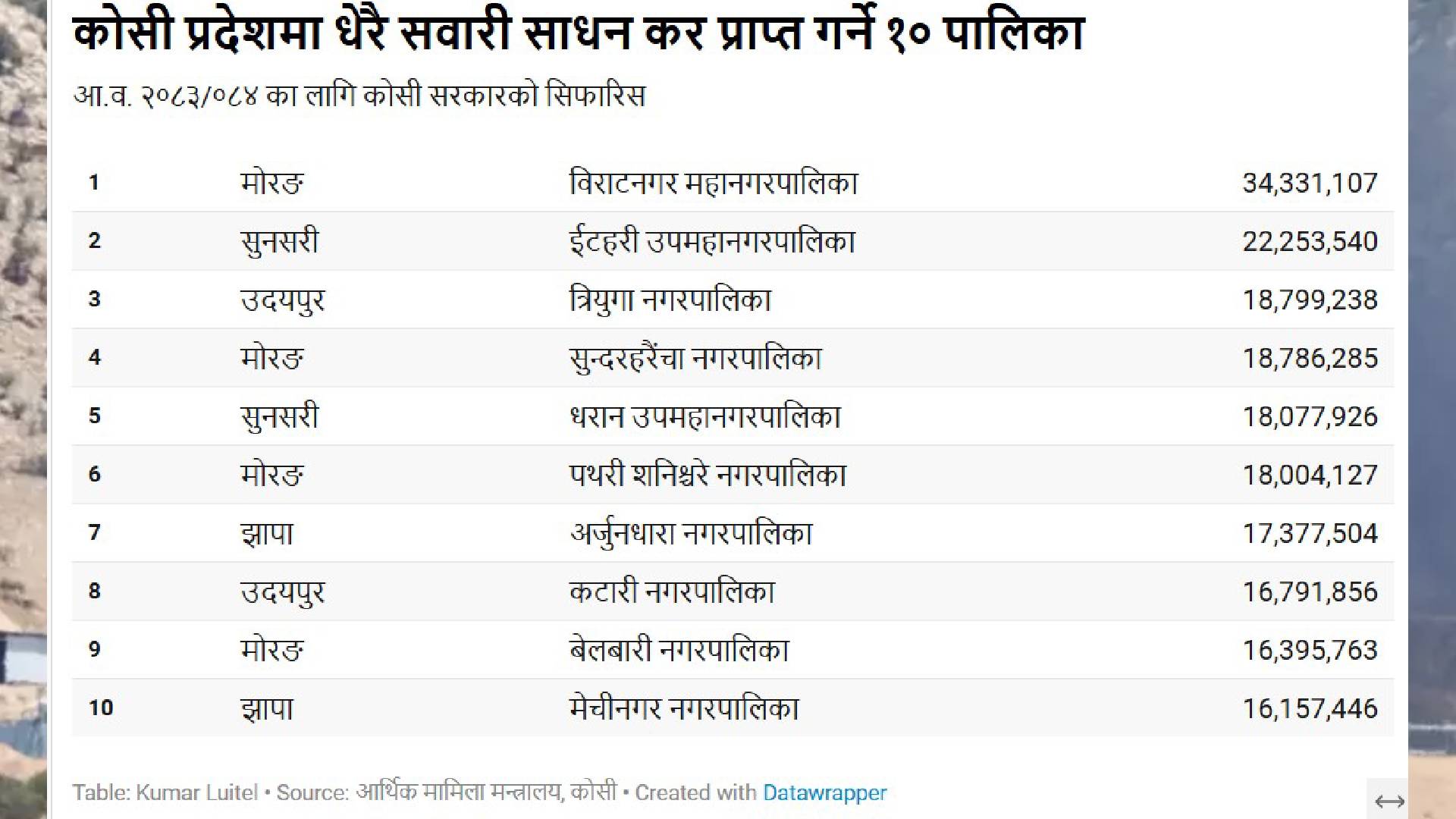 कोसीका स्थानीय तहमा सवारी कर बाँडफाँट, धेरै प्राप्त गर्नेमा विराटनगर पहिलो हुँदा अर्जुनधारा सातौँ र मेचिनगर दशौँ
