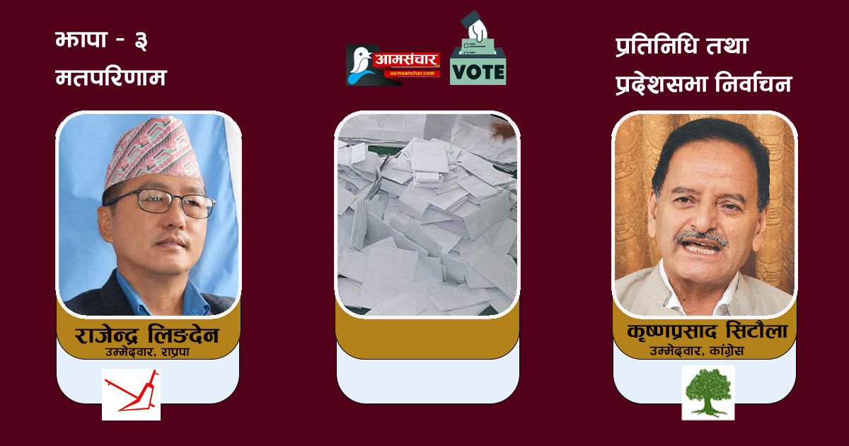 झापा क्षेत्र नं. ३ ताजा मत परिणाम गणना भएको मत : ३९०७ राष्ट्रिय प्रजातन्त्र पार्टी (हलो) १९६४ कांग्रेस (रुख) १५०२