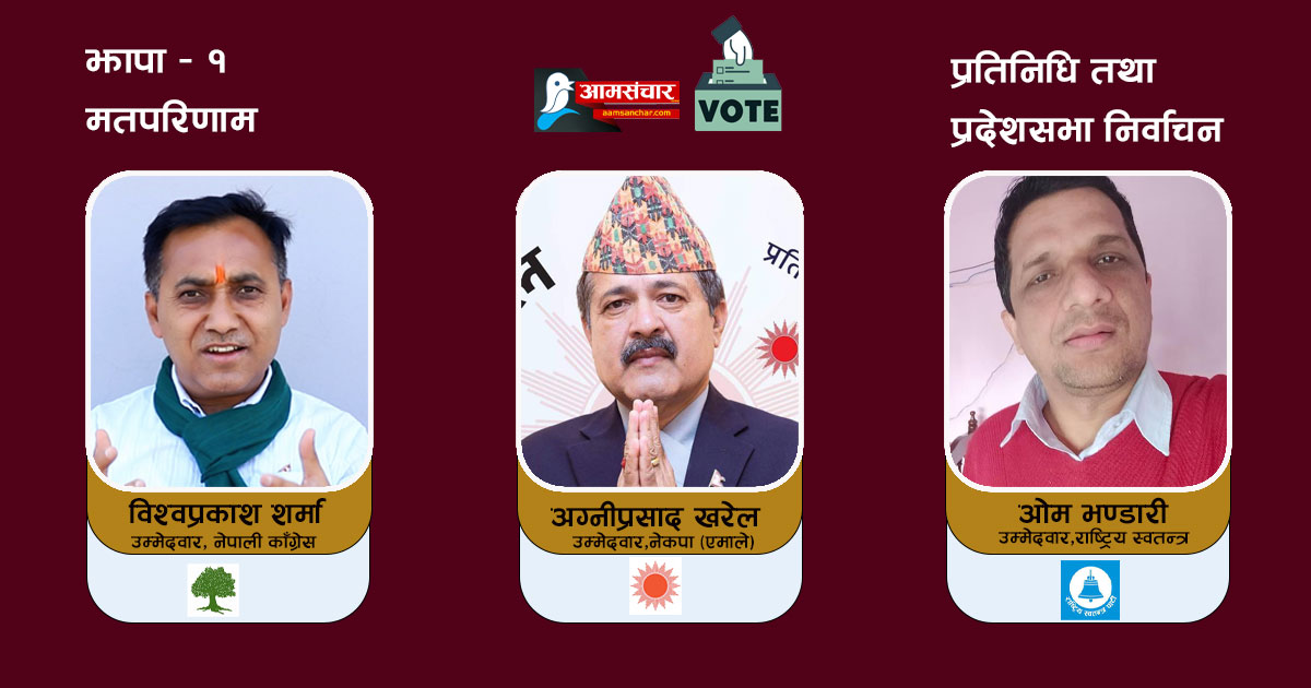 झापा क्षेत्र नं. ४ ताजा मत परिणाम गणना भएको मत: ३४३२ राष्ट्रिय स्वतन्त्र (घण्टी) १३४८ एमाले (सूर्य) १११८ कांग्रेस (रुख) ६३३