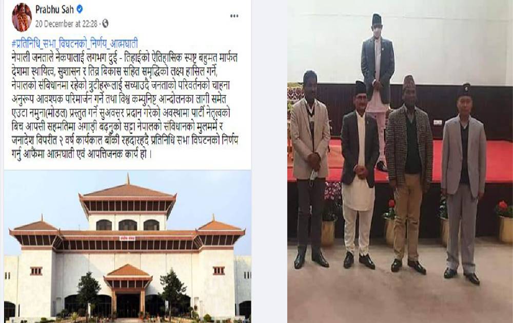 काठमाडौं । प्रधानमन्त्री केपी शर्मा ओलीले प्रतिनिधिसभा विघटनलाई आत्मघाती भनेको छ दिनपछि प्रभु साहले मन्त्रीको शपथ ग्रहण गरेका छन् । उनले सहरी विकास मन्त्रीको जिम्मेवारी पाएका छन् । उनी दुई दिनअघि पनि प्रचण्ड–नेपाल समूहको बैठकमा […]