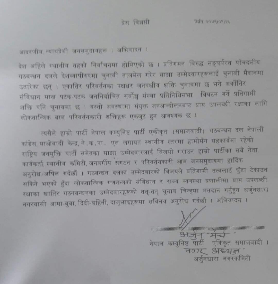 काठमाडौं । माधव कुमार नेपाल नेतृत्वको नेकपा एकीकृत समाजवादी कलम चिह्न लिएर स्थानीय तह निर्वाचनमा होमिएको छ । पाँच दलीय गठबन्धनसँग चुनावी तालमेल गरेको समाजवादीले ललितपुरको महालक्ष्मी नगरपालिकामा भने एक्लै लडेको छ । मंगलबार समाजवादीको […]