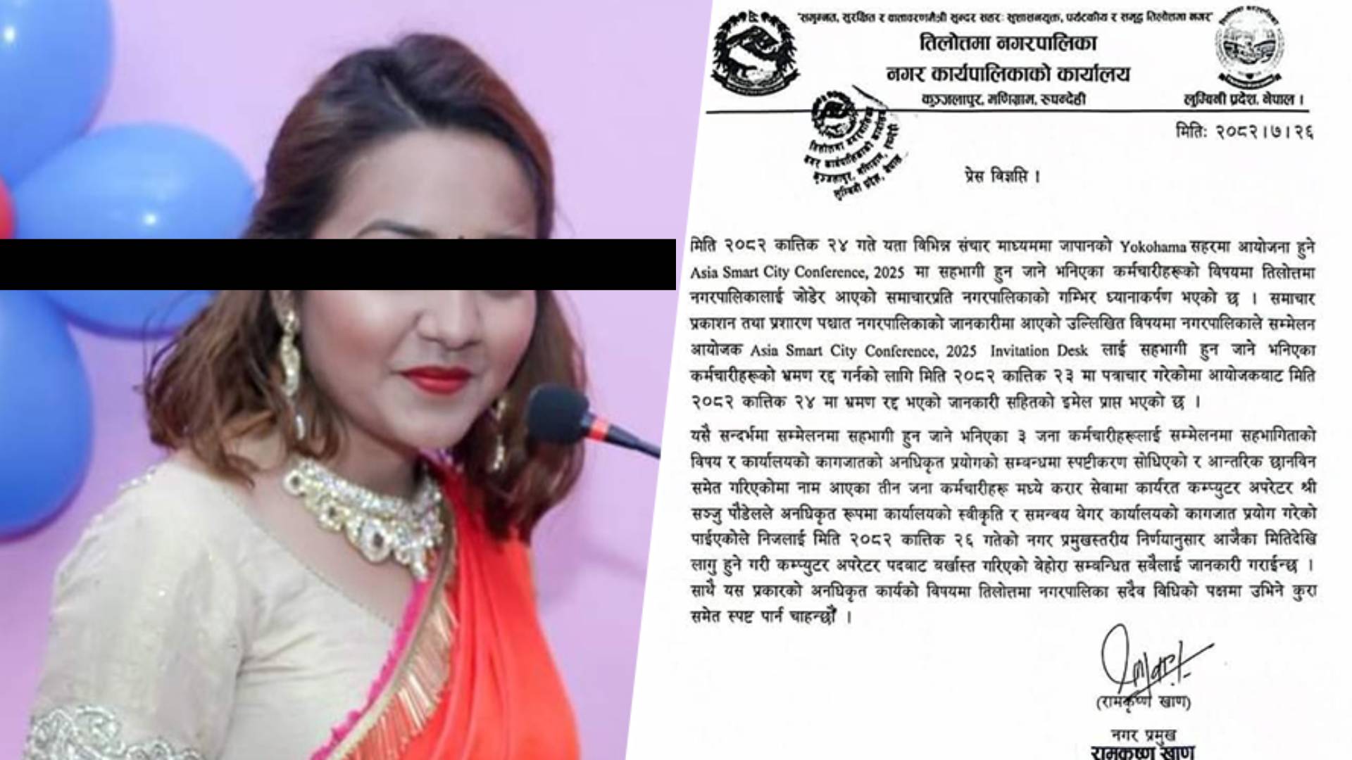 बुटवल – रुपन्देहीको तिलोत्तमा नगरपालिकाले जापानमा आयोजना हुन लागेको स्मार्ट सिटी सम्मेलनमा भाग लिन अनधिकृत कागजात बनाएको पाइएपछि आफ्नै कर्मचारीलाई बर्खास्त गरेको छ । नगरपालिकाले कम्प्युटर अपरेटरमा हालै मात्र नियुक्त सन्जु पौडेललाई बुधबार बसेको नगर […]