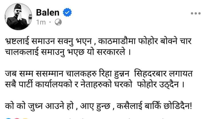 काठमाडौँ । काठमाडौँ महानगरका मेयर बालेन्द्र शाह (बालेन) ले सिहदरबारलगायत सबै पार्टी कार्यालयको र नेताहरुको घरको फोहोर नउठ्ने चेतावनी दिएका छन् । सामाजिक सञ्जालमा लेख्दै बालेनले भ्रष्टलाई समाउन नसकेको तर काठमाडौमा फोहोर बोक्ने चार चालकलाई […]
