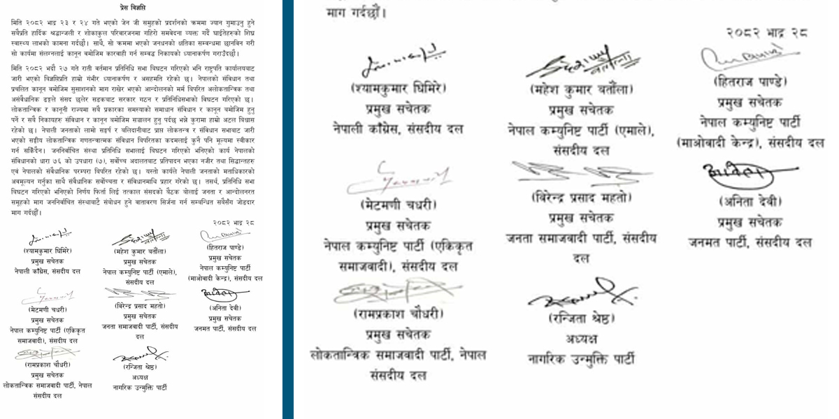 काठमाडौं । आठ राजनीतिक दलले प्रतिनिधि सभा विघटनलाई असंवैधानिक भन्दै तत्काल फिर्ता लिन सरकार र राष्ट्रपति कार्यालयसँग माग गरेका छन्। शनिबार संयुक्त विज्ञप्ति जारी गर्दै दलहरूले संसद विघटन लोकतान्त्रिक मूल्य–मान्यता र संवैधानिक सर्वोच्चतालाई कमजोर पार्ने कदम […]