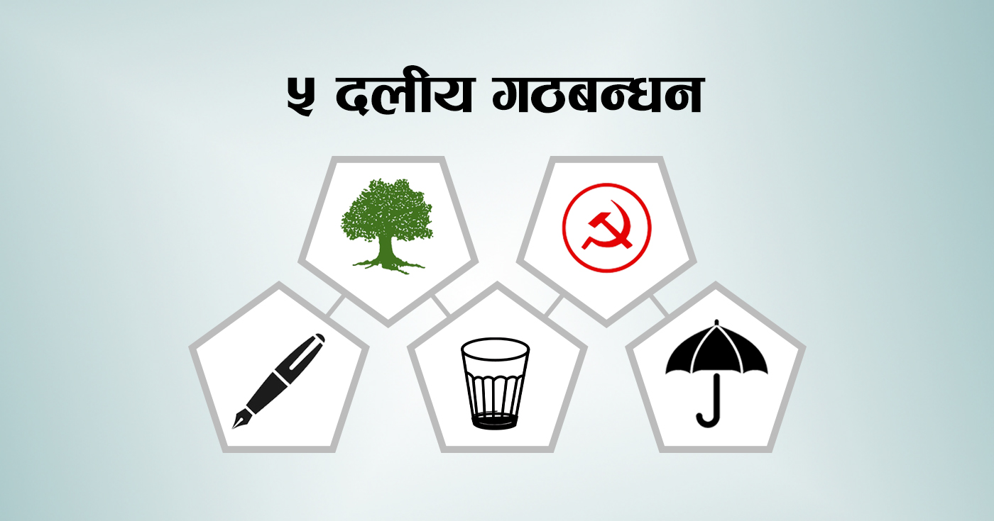 काठमाडौँ । पाँच दलीय सत्तारुढ गठबन्धन दलहरुले चुनावी तालमेलका लागि आआफ्नो दाबी पेश गरेका छन् । गठबन्धनको कार्यदलसहित शीर्ष नेताहरुको बैठक हिजो अपराह्न प्रधानमन्त्री निवास बालुवाटारमा बसेको थियो । बैठकमा कार्यदलका तर्फबाट नेपाली कांग्रेसले १००, […]