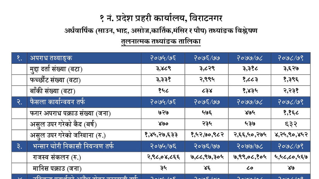 बिराटनगर। संगठन प्रमुख प्रहरी महानिरीक्षक र प्रदेश प्रहरी प्रमुख प्रहरी नायव महानिरीक्षक तथा प्रदेश प्रहरी प्रमुख र प्रदेशका १४ वटै जिल्लाका प्रहरी प्रमुखहरु बिच कार्य सम्पादन सम्झौताको प्रभावकारी कार्यान्वयन हुँदा यस आर्थिक बर्षको पहिलो अर्धवार्षिकमा […]